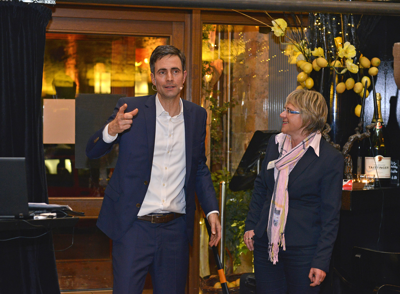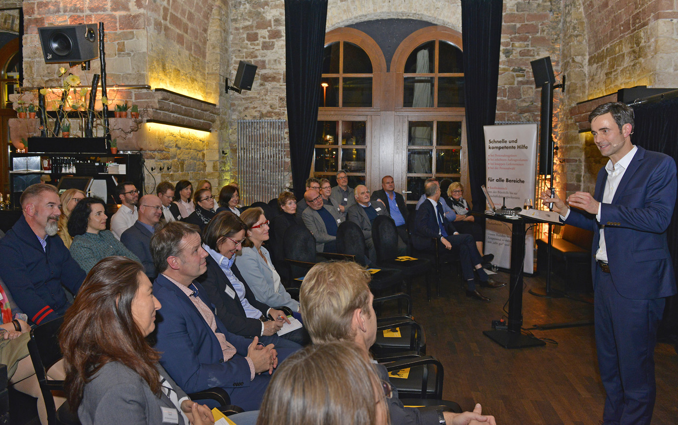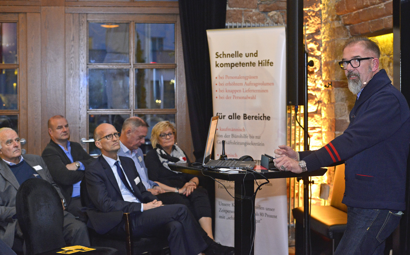 Im Fokus des Abends stand der Hauptvortrag von Markus Jotzo mit dem Titel "Der Chef, den keiner mochte - warum Führungskräfte nicht nett sein müssen". Erfolgreiche Zusammenarbeit kann nur dann entstehen, wenn Mitarbeiter nicht nur gefordert sondern auch gefördert werden. Erforderlich ist es, die Mitarbeiter aus der Komfortzone in die Wachstumszone zu bringen. Aber nur wenn man als Führungskraft seine Mitarbeiter anweist, klar kommuniziert, aber auch mal los lässt und Entscheidungen treffen lässt, kann erfolgreiche Zusammenarbeit entstehen.