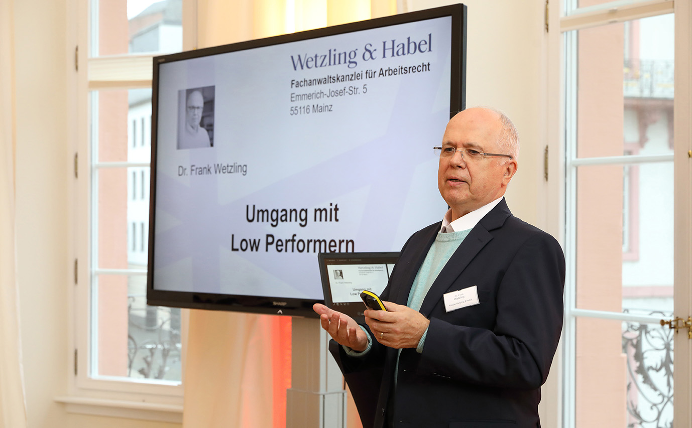 Anschließend referierte Rechtsanwalt Dr. Frank Wetzling von Wetzling & Habel, einer Fachanwaltskanzlei für Arbeitsrecht, zu dem Thema „Umgang mit Low Performern“. Hierzu findet am 07.11.2019 ein Arbeitsrechtsfrühstück mit juristischer Unterstützung von Kanzlei Wetzling & Habel statt. Eine Einladung hierzu erfolgt rechtzeitig.
