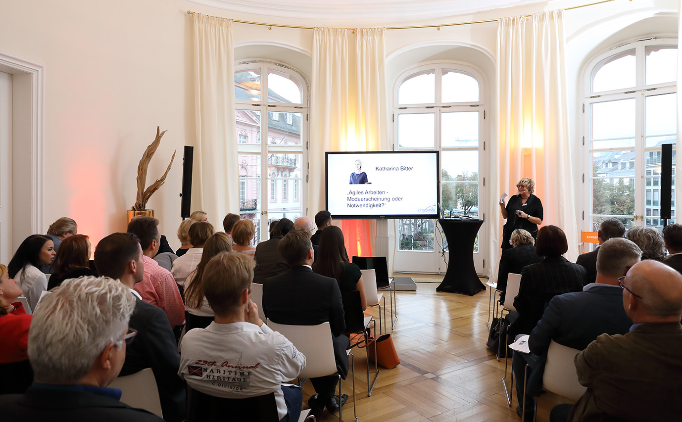 Als Hauptreferentin des Abends sprach Katharina Bitter über das Thema "Agiles Arbeiten". Anhand praxisnaher Beispiele erklärte sie den interessierten Gästen, das es mitunter sehr aufwendig sei agiles Arbeiten in Unternehmen einzuführen. Alte Strukturen aufzubrechen, Mitarbeiter und Führungskräfte in neu strukturierte Arbeitsweisen, Abläufe und Methoden des "Miteinander" einzubinden, gelingt mit Sicherheit nicht überall. Dennoch ist es lohnenswert, weil in diesem Prozess Eigenverantwortlichkeit des Einzelnen gefordert und gefördert wird und die Produktivität ansteigt. Die anschließende Diskussion zeigte, das das Thema "Agiles Arbeiten" den Nerv der Zeit in der Arbeitswelt trifft!