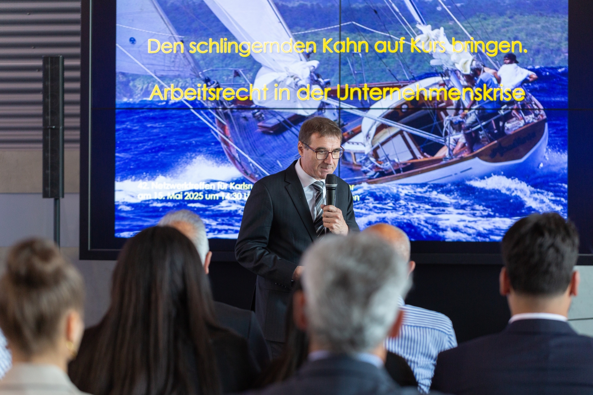Den Auftakt machte Dr. Reinhard Möller von Bartsch Rechtsanwälte mit seinem Vortrag „Den schlingernden Kahn wieder auf Kurs bringen. Arbeitsrecht in der Krise“. Dabei ging es um konkrete arbeitsrechtliche Maßnahmen, die Unternehmen in wirtschaftlich herausfordernden Zeiten handlungsfähig machen. Besonders im Fokus standen rechtssichere Entscheidungen unter Druck und kurzfristige Strategien im HR-Bereich.