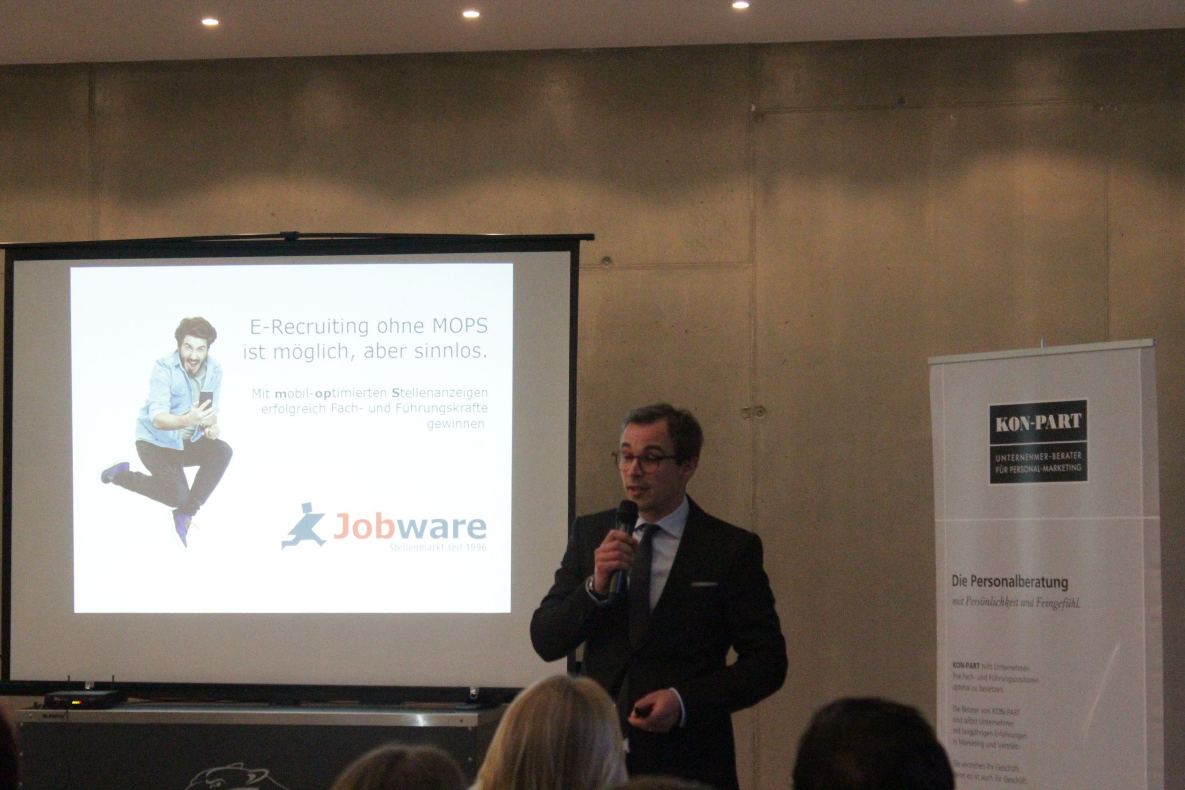 Das erste Mal dabei war der neue bundesweite Sponsor jobware. In Person von Deniz Bock wurde der Abend mit dem Thema "Mobil optimerte Stellenanzeige (MOPS)" eröffnet. Er analysierte das momentane Bewerberverhalten und gab Tipps wie man auf die Veränderungen als Unternehmen reagieren kann. Besonders mobile-recruiting wird seiner Meinung nach noch mehr an Bedeutung zunehmen.