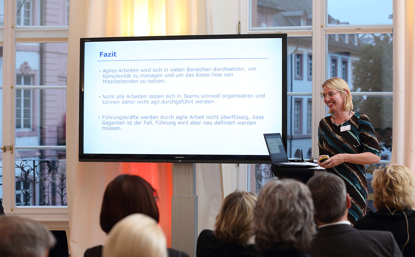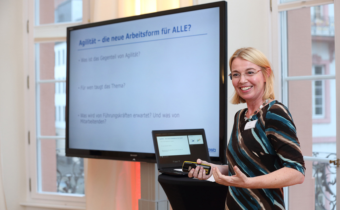 Als Hauptreferentin des Abends sprach Katharina Bitter über das Thema "Agiles Arbeiten". Anhand praxisnaher Beispiele erklärte sie den interessierten Gästen, das es mitunter sehr aufwendig sei agiles Arbeiten in Unternehmen einzuführen. Alte Strukturen aufzubrechen, Mitarbeiter und Führungskräfte in neu strukturierte Arbeitsweisen, Abläufe und Methoden des "Miteinander" einzubinden, gelingt mit Sicherheit nicht überall. Dennoch ist es lohnenswert, weil in diesem Prozess Eigenverantwortlichkeit des Einzelnen gefordert und gefördert wird und die Produktivität ansteigt. Die anschließende Diskussion zeigte, das das Thema "Agiles Arbeiten" den Nerv der Zeit in der Arbeitswelt trifft!